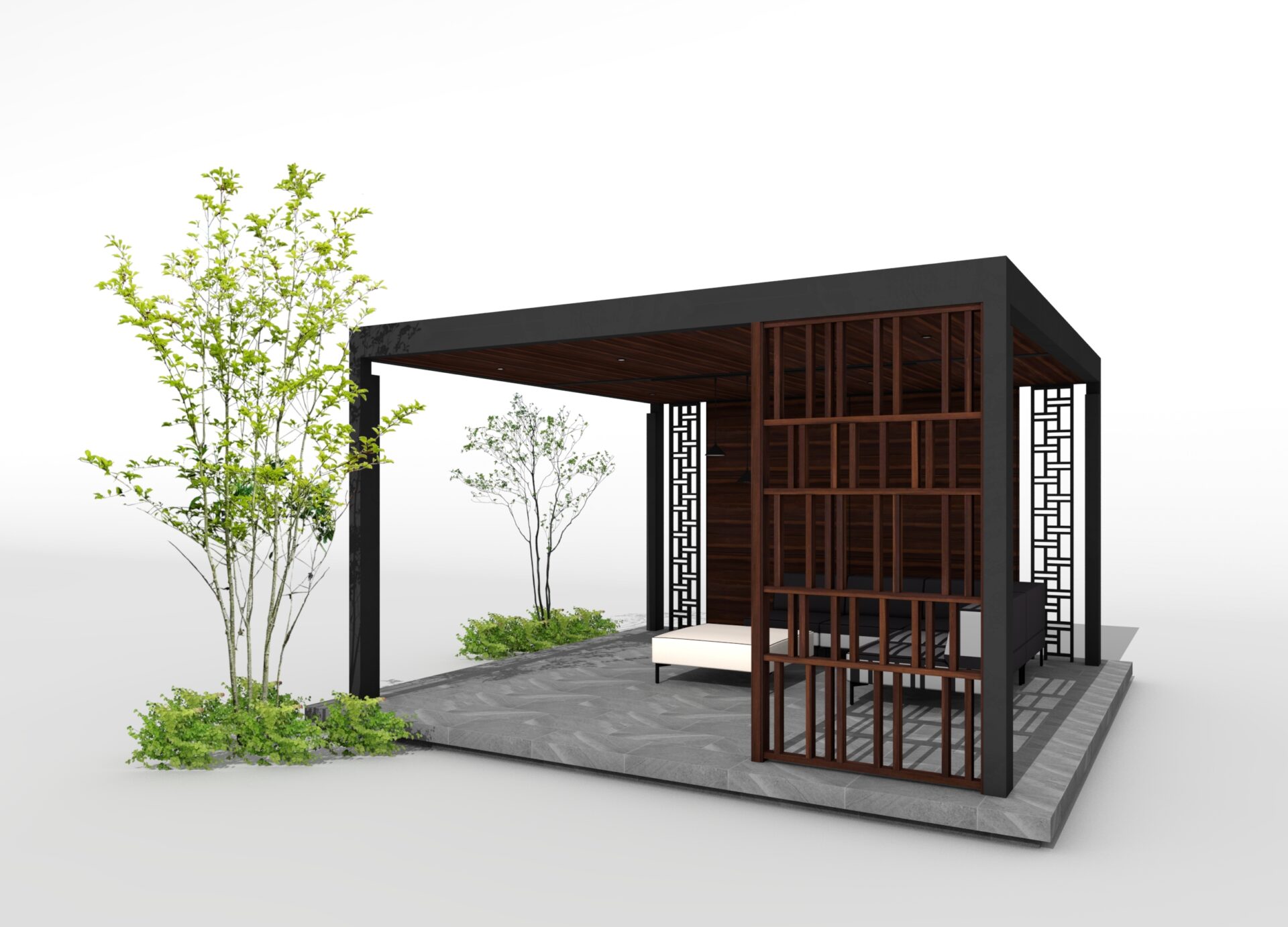 マットブラックのホームヤードルーフに、深いブラウンのエバーアートボードを合わせた、シックなテイストのガーデンプランです。壁面の両側に設けたニッチスクリーンが程よい視線のコントロールをしつつ、空間に上質なアクセントを添えています。広めのソファを配置すれば、心からリラックスできる心地よいアウトドアリビングが生まれます。