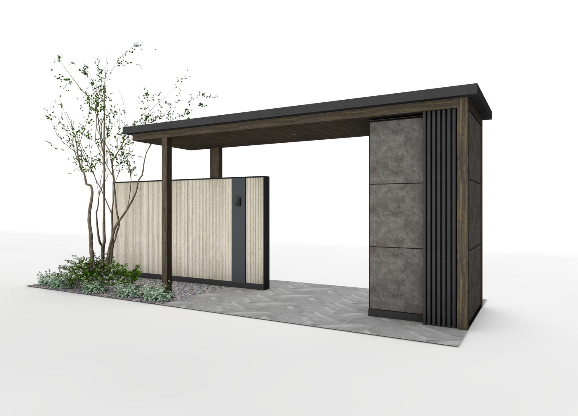 ホームヤードルーフⅡシングルの移動柱仕様と、エバーアートボードウォールセットDS2型の組み合わせです。木目調の柄があたたかみを加えた門構えとなっています。