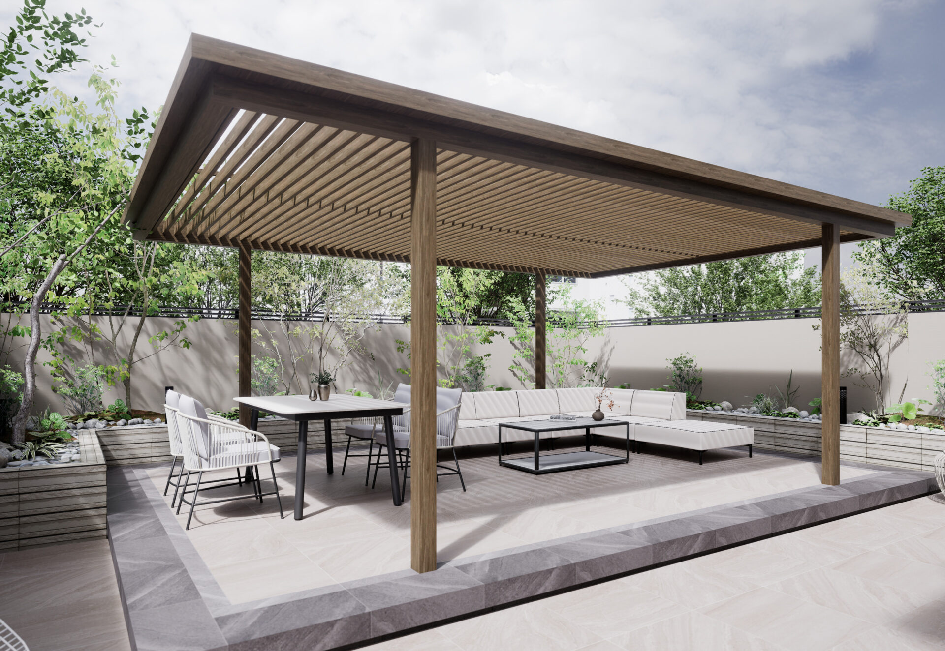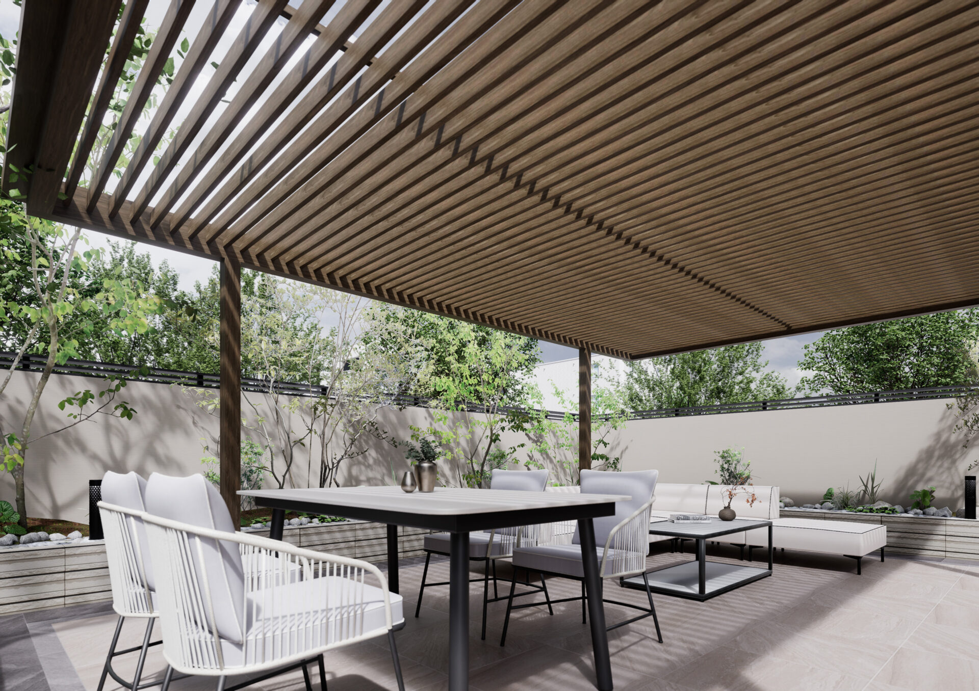 木目調の繊細なルーバーが幾重なり、柔らかな陽光をフィルターにする天井が心地よい開放感を演出します。都会の喧騒を忘れ、ゆったりとくつろぎの時間を満喫できる、まさに大人のためのプライベートガーデンです。