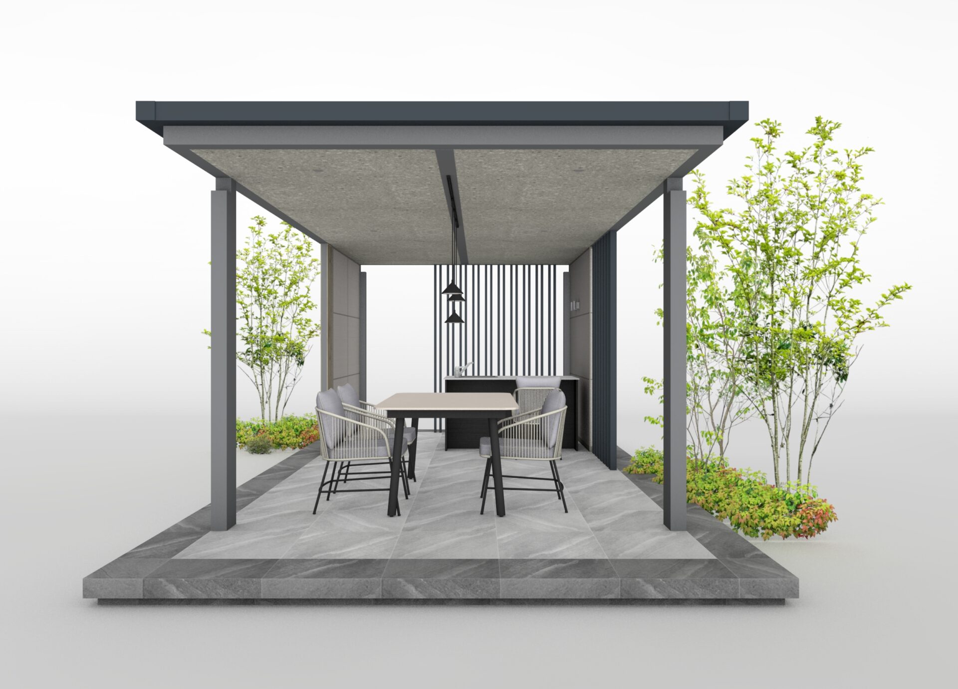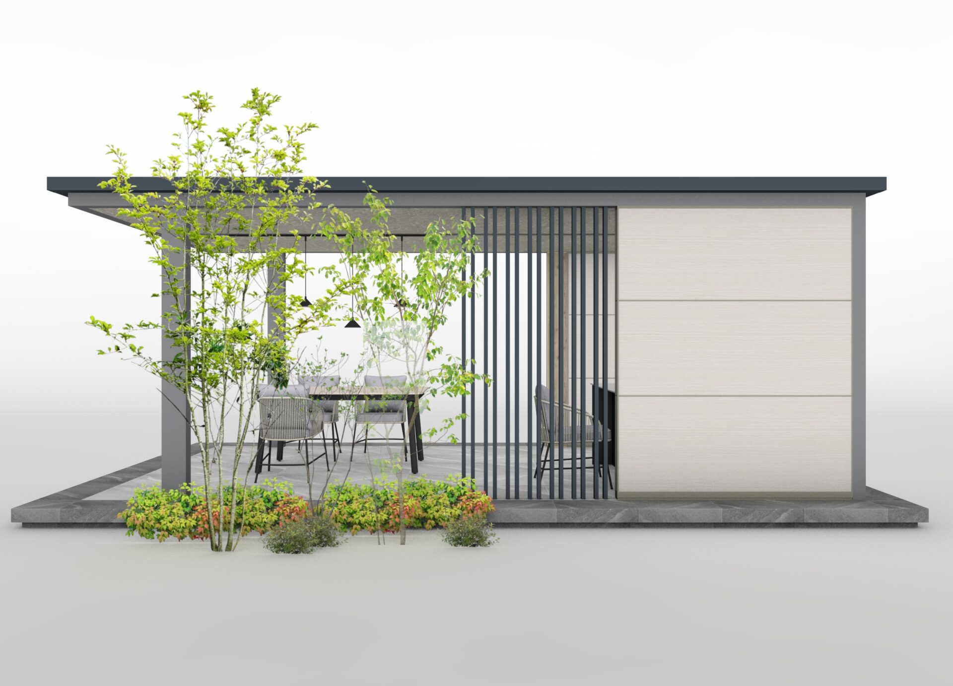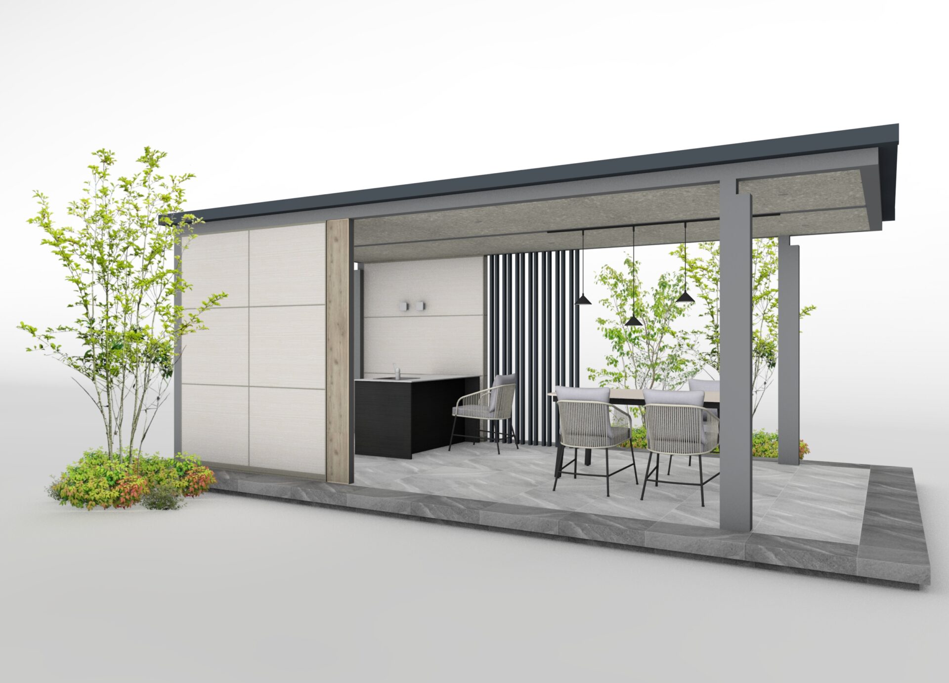 マットライトグレーのホームヤードルーフに、テラゾグレーの壁面セットを組み合わせた、シックなガーデンプランです。 一部を壁面セットとスリットで囲うことで、周囲との視線をほどよく遮り、プライベート感のある空間に仕上げました。 シンクとファニチャーを設えることで、アウトドアダイニングとして楽しめる、特別なひとときが生まれます。