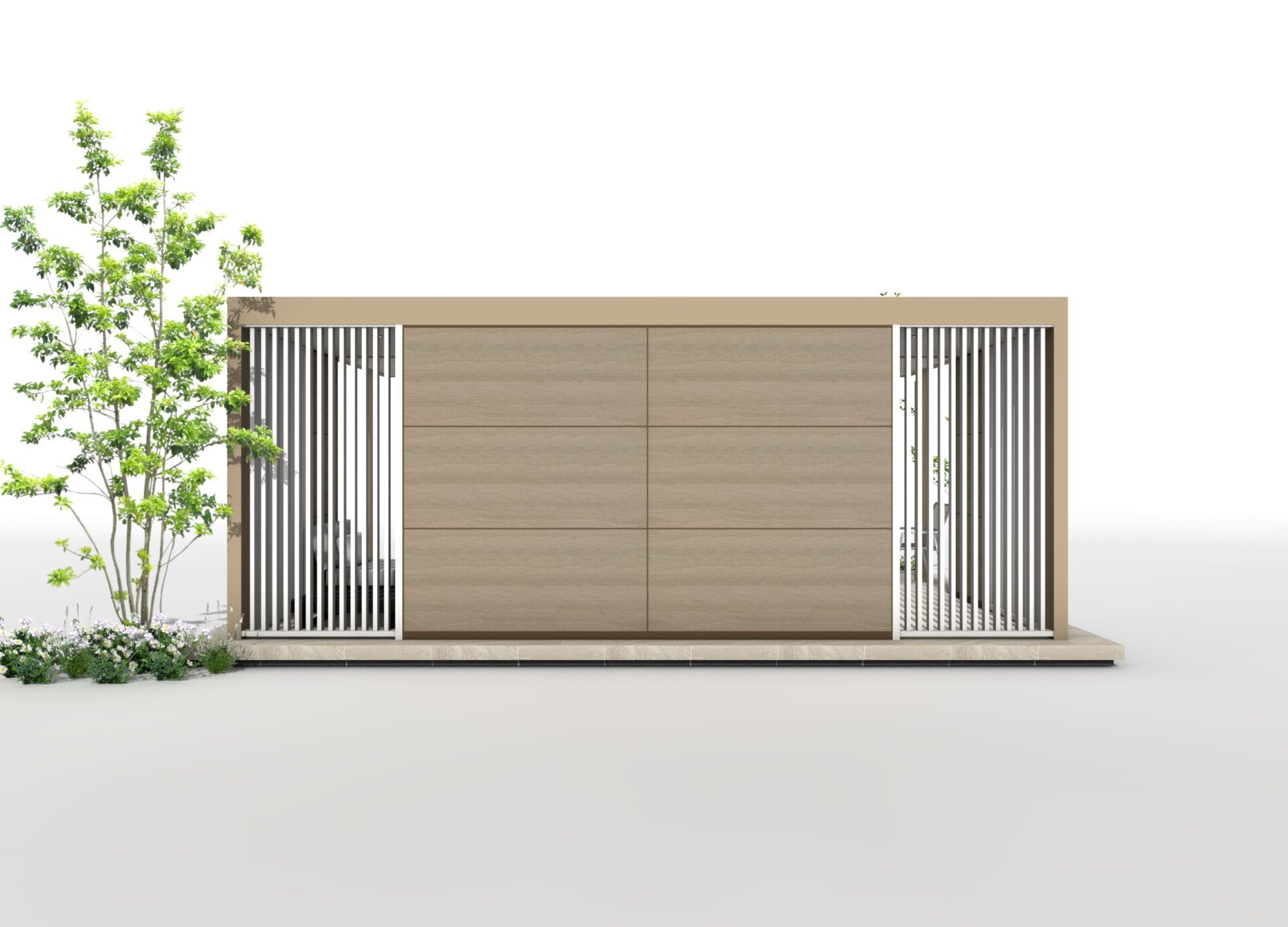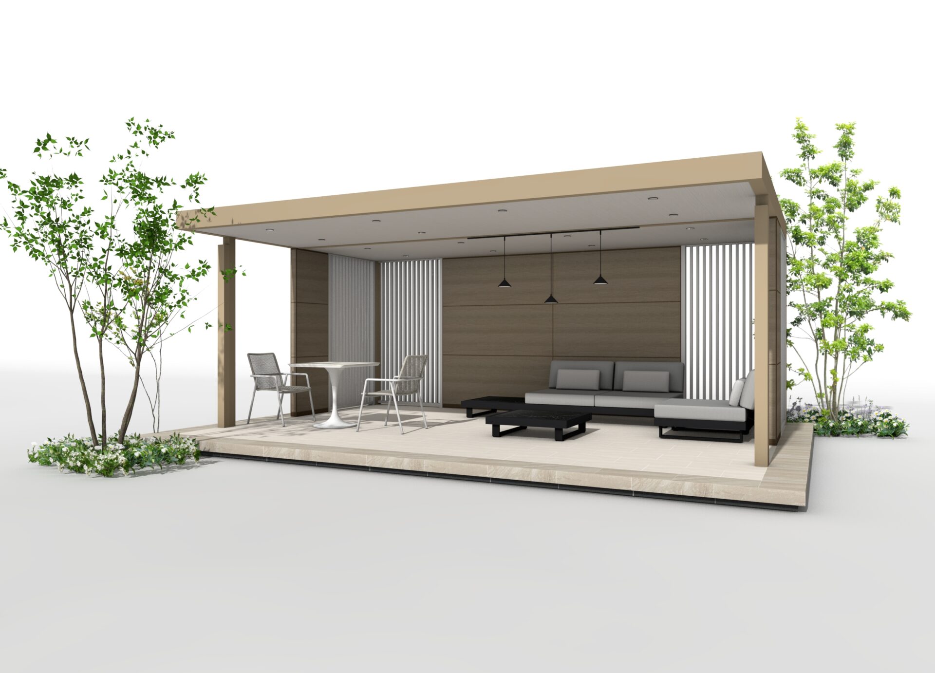 マットベージュを基調としたホームヤードルーフで、やさしく落ち着いた雰囲気のテラス空間を演出するプランです。 木調パネルと縦格子スクリーンを組み合わせることで、程よく視線を遮りながら居心地のよいアウトドアリビングをつくります。 くつろぎの時間を楽しめる上質な外部空間に仕上げました。